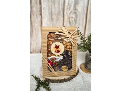Vánoční balíček s čokoládovými výrobky Janský. Balíček obsahuje: Mléčná čokoláda Mistrova pečeť 100g Tmavá čokoláda s karamelizovanými mandlemi 100g Karamelizované oříšky...